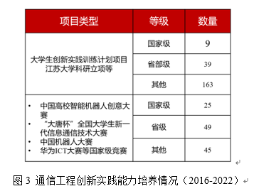 专业近年来积极推进学生的创新实践能力培养,实施以未来通信与网络开发、机器人通信开发为代表的创新实践训练,并组织学生参加多个国A赛事、申报创新训练项目,极大地提升了学生的创新意识与实践能力。2016~2022年,本专业学生获批大学生创新实践训练计划项目等创新项目共231项,其中国家级9项、省部级39项、校级和地市级163项;在中国高校智能机器人创意大赛、“大唐杯”全国大学生新一代信息通信技术大赛、中国机器人大赛、华为ICT大赛等国A竞赛中获得国家级奖项25项、省级49项、其他奖项45项。