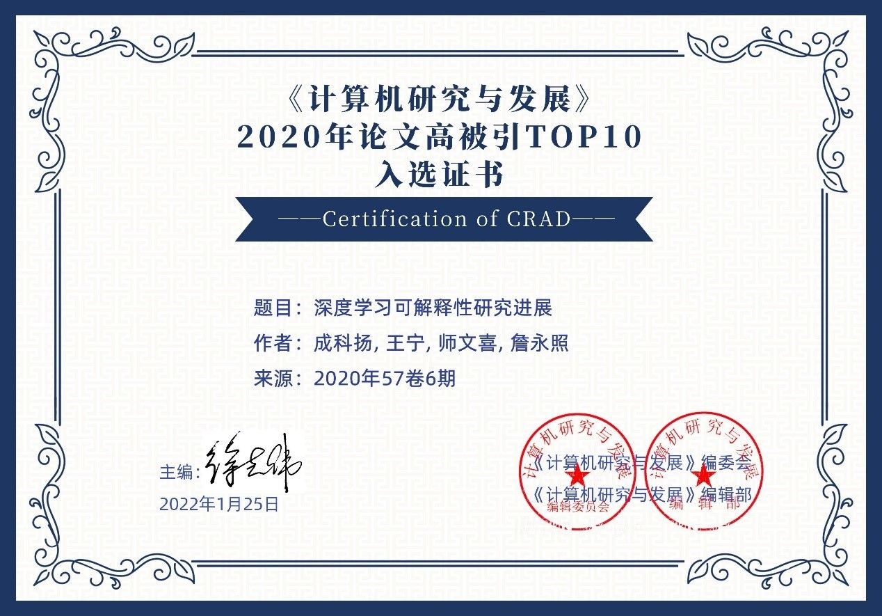 Recently, the research team of the multimedia and intelligent computing research direction of the School of Computer Science published a review paper "Research Progress in the Explanatory Nature of Deep Learning" (Volume 57, Issue 6, 2020) in the top domestic journal Computer Research and Development in the computer field. It was evaluated by the editorial board of Computer Research and Development and was selected into the top 10 highly cited papers in 2020 (ranking top 2). This paper was jointly completed by Cheng Keyang, a professor and doctoral supervisor of the School of Computer Science, Wang Ning, a graduate student, Shi Wenxi, a researcher of the Chinese Academy of Electronic Science, and Professor Zhan Yongzhao of our university. Jiangsu University is the first completion unit. This research achievement was supported by the National Natural Science Foundation of China (NSFC) oriented project (research on interpretable deep neural network for urban visual perception analysis), and the National Engineering Laboratory Director Fund for Social Security Risk Perception and Prevention and Control Big Data Application (PSRPC2018).