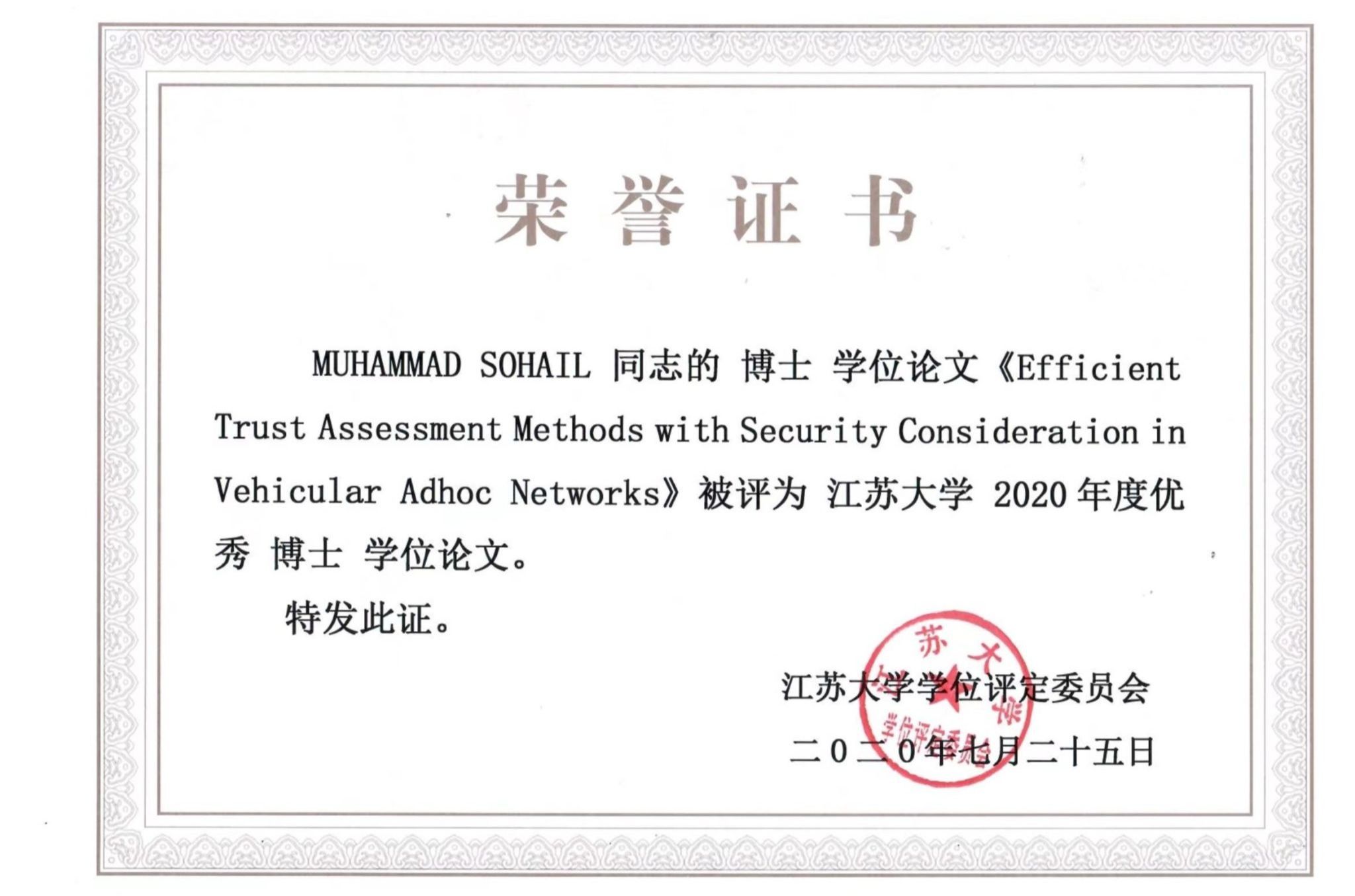 2020 JSU Excellent Doctoral Dissertation Award -Muhammad Sohail